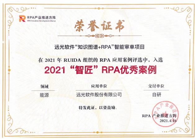 近日,以“重塑數(shù)字生產(chǎn)力,賦能 IT 新時代”為主題的“2021 RPA 創(chuàng)新產(chǎn)業(yè)峰會(RIIS)”在北京召開。遠光軟件作為RPA+AI領(lǐng)域的領(lǐng)軍企業(yè)受邀出席大會,其“知識圖譜+RPA”智能審單項目案例榮獲大會頒發(fā)的“2021‘智匠’RPA優(yōu)秀案例”獎。