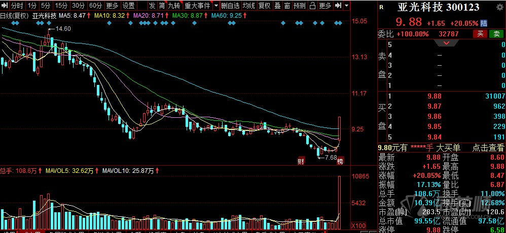 關注同花順財經(ths518),獲取5月13日,亞光科技(300123)高開高走,并放出天量成功收獲20cm漲停,報9.88元/股,全天成交10.39億元,換手率11%。到底是什么原因使得股價低迷多日的亞光科技暴漲呢?或與昨日公告有關。