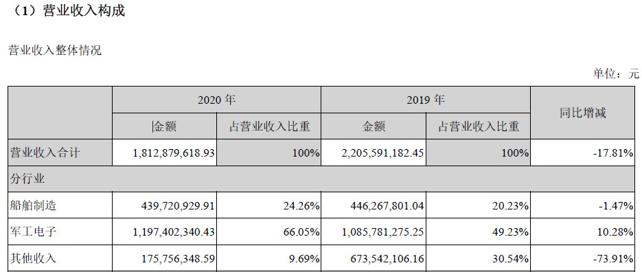 根據2020年年報,亞光科技的船舶制造收入僅占總營業收入的20%。