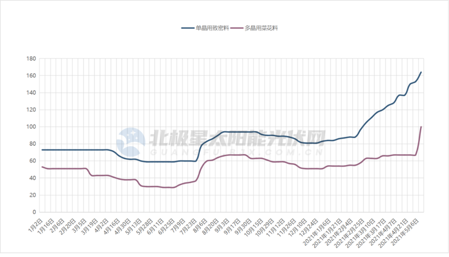 根據(jù)最新價格公示,本周單晶用致密料價格漲至164元/kg,較年初上漲98%,市場最高成交價甚至來到180元/kg,多晶用菜花料價格也達到100元/kg。