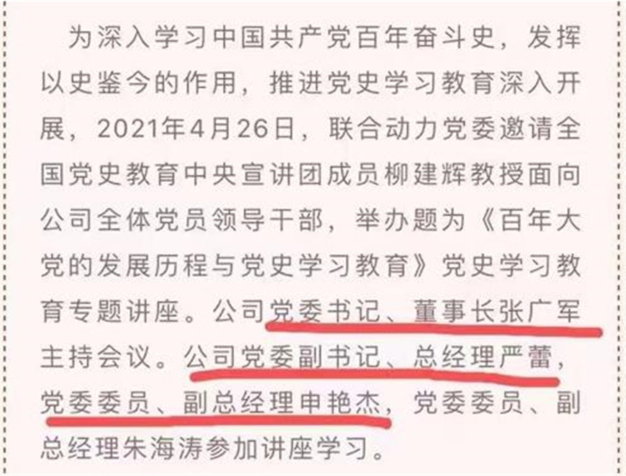 而在4月26日,主持聯(lián)合動(dòng)力公司黨史學(xué)習(xí)教育專題講座的則變成了聯(lián)合動(dòng)力黨委書記、董事長張廣軍,公司黨委副書記、總經(jīng)理嚴(yán)蕾,黨委委員、副總經(jīng)理申艷杰參加講座學(xué)習(xí)。