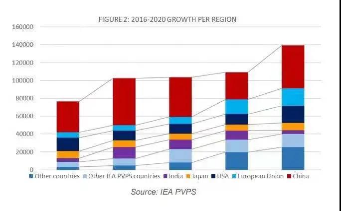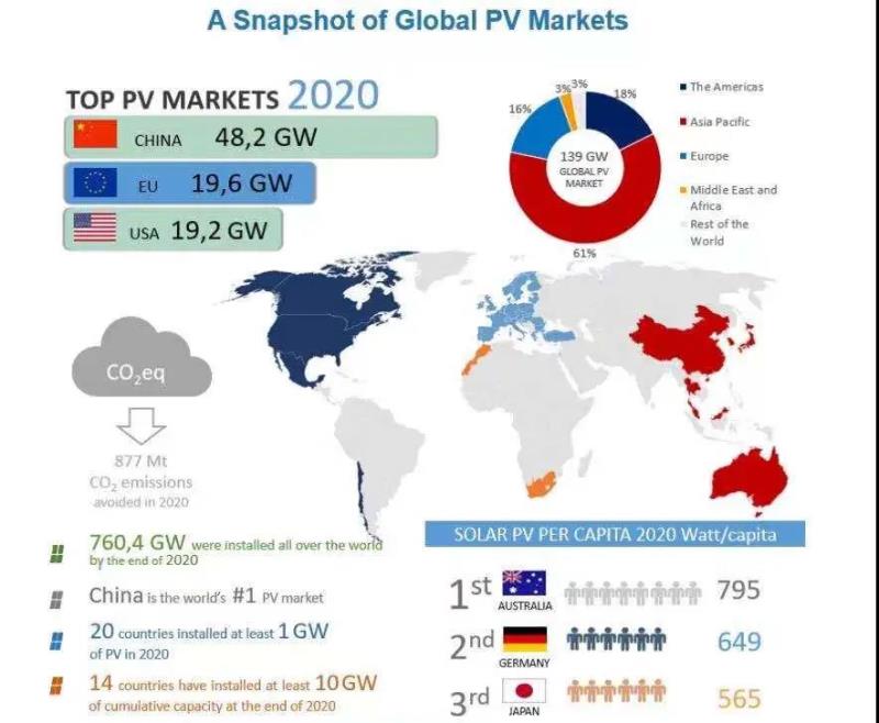 近日,國(guó)際能源署(IEA)發(fā)布了2020年全球光伏報(bào)告,報(bào)告顯示,盡管COVID-19疫情在過去的一年多全面爆發(fā)和流行,但全球光伏市場(chǎng)再次實(shí)現(xiàn)顯著增長(zhǎng),DC側(cè)裝機(jī)容量為134GW,截止2020年底,全球累計(jì)光伏裝機(jī)760.4GW。有20個(gè)國(guó)家的新增光伏容量超過了1GW。其中中國(guó)、歐盟和美國(guó)分別以48.2GW、19.6GW和19.2GW的規(guī)模位列全球前三。
