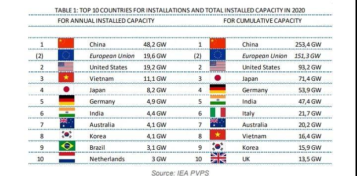 2020年新增光伏裝機(jī)的前十個(gè)國(guó)家分別為:中國(guó)、美國(guó)、越南、日本、德國(guó)、印度、澳大利亞、韓國(guó)、巴西和荷蘭。在過去幾年裝機(jī)容量很大的幾個(gè)國(guó)家,包括法國(guó)、墨西哥和土耳其等,發(fā)展勢(shì)頭明顯減弱,已經(jīng)退出了前十的位置。