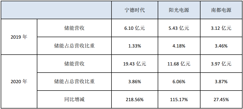 從上表中可以看出,寧德時(shí)代、陽光電源與南都電源2020年儲(chǔ)能業(yè)務(wù)營收都有增長,尤其是寧德時(shí)代和陽光電源,南都電源增速相對較慢。其中,寧德時(shí)代作為動(dòng)力電池頭部企業(yè),儲(chǔ)能營收增長速度最為明顯,是2019年的3倍以上,陽光電源也的儲(chǔ)能營收也實(shí)現(xiàn)了翻一番。
