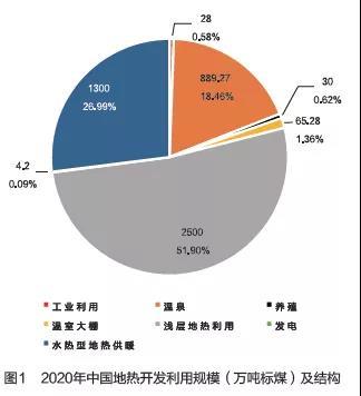 綜合供暖、發電、溫泉、養殖以及農業等領域地熱裝機容量以及供暖制冷面積等數據測算,到2020年,中國地熱實際利用量折合4800萬噸標煤,完成規劃目標的近70%。現有地熱能利用結構中,淺層地熱利用位居首位,占比52%;其次是水熱型地熱供暖,占比27%,繼續保持增長;再次是溫泉利用,占比18%,其余利用方式占比3%(見圖1)。