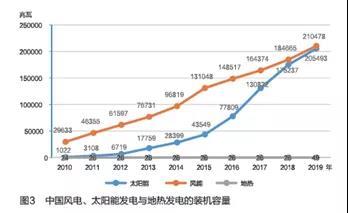 近10年,中國風電、太陽能發電裝機保持快速增長態勢。2019年,非化石能源發電裝機占總裝機容量的41%,風電和太陽能發電裝機容量之和達40萬兆瓦以上,地熱僅49兆瓦(見圖3)。在太陽能、風電等已獲先發優勢的條件下,發揮地熱發電的后發優勢,是增強風電、太陽能發電供應穩定性的有利選擇。