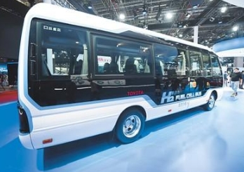 圖為4月上海車展上展出的采用氫燃料電池為動力的國產豪華中巴,該車型將在北京2022冬奧會上投入使用。