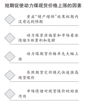 李學(xué)剛介紹,短期來看促使動力煤現(xiàn)貨價格上漲的因素有5個。一是重啟“增產(chǎn)增供”效果短期內(nèi)沒有達(dá)到預(yù)期;二是動力煤資源偏緊和市場看漲情緒不斷累積和發(fā)酵;三是動力煤期貨價格率先大幅上漲;四是參照期貨定價模式快速推高現(xiàn)貨煤價;五是市場情緒對現(xiàn)貨煤價的助漲作用。