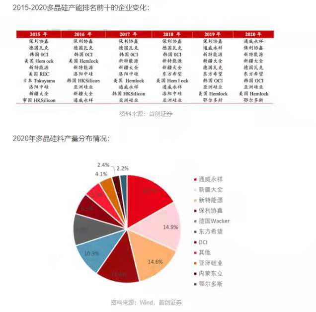 首創(chuàng)證券數(shù)據(jù)顯示,2020年,東方希望產(chǎn)能位居全球第六位,落后于通威、協(xié)鑫、新特、大全、德國瓦克,領(lǐng)先于韓國OCI、亞洲硅業(yè)、美國Hemlock;2020年多晶硅產(chǎn)量同樣位居全球第六位,占比9.6%,落后于通威、大全、新特、協(xié)鑫、德國瓦克。