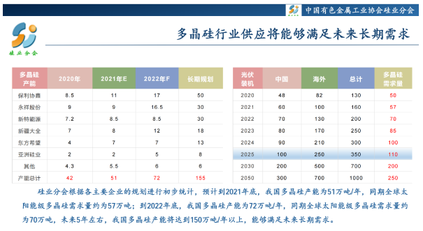 中信證券預(yù)計2021年、2022年全球光伏新增裝機165GW、200GW左右,在1:1.2的容配比下,對應(yīng)的多晶硅需求量分別為58萬噸和70萬噸,2022年多晶硅的供給仍將保持緊平衡狀態(tài)。雖然對2023年多晶硅供應(yīng)市場沒有更多分析,但業(yè)內(nèi)大多認(rèn)為2022年下半年多晶硅的供給情況將會開始得到有效緩解,價格或?qū)⑾滦小?/p>