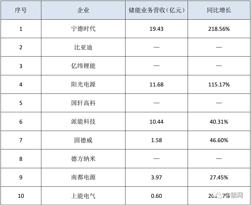 2020年儲能概念股儲能業(yè)務營收