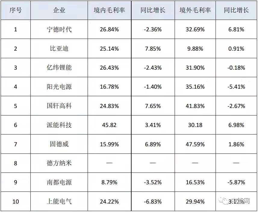 2020年儲能概念股毛利率