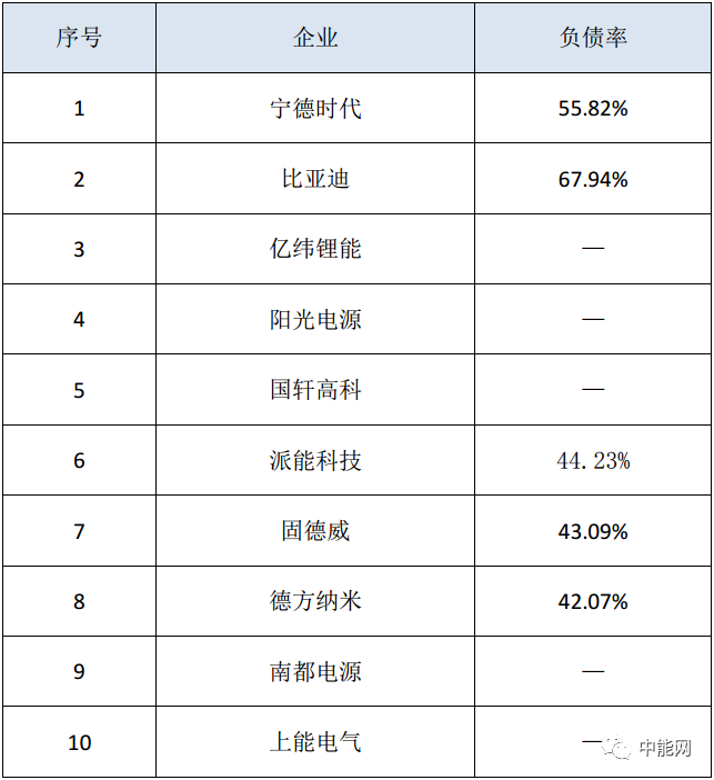 2020年儲能概念股負債率