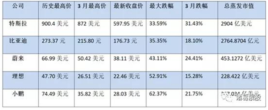 如果從歷史最高價(jià)算,在短短的兩三個(gè)月內(nèi),特斯拉、比亞迪、蔚來(lái)、小鵬、理想這五家新能源汽車的市值累計(jì)蒸發(fā)了超過(guò)2.8萬(wàn)億人民幣的市值,光是特斯拉一家就蒸發(fā)了超過(guò)1.8萬(wàn)億人民幣的市值。
