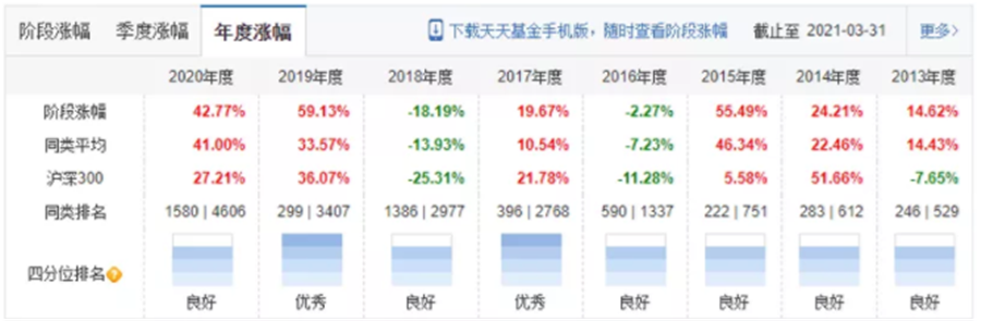 雖然成立的時間點比較尷尬,但在2016年,周應波仍然取得了15.06%的正收益,成立至今(截止到2021年6月9日)基金獲得了323.98%的累計收益,在同期同類基金排名中位居第三,僅次于趙蓓的“工銀前沿醫療”和蕭楠的“易方達消費行業”。出色的業績使基金規模從成立之初的2000多萬元增長到如今的214億元。