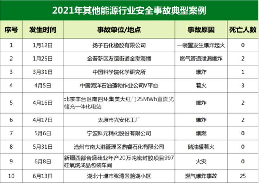 除電力、煤礦事故外,其他能源行業(yè)安全事故也時(shí)有發(fā)生。國際能源網(wǎng)記者總結(jié)了2021年典型能源安全事故發(fā)現(xiàn),其他能源行業(yè)安全事故多為火災(zāi)事故。天然氣、化工廠、儲能電站依然是火災(zāi)事故隱患較為集中的領(lǐng)域。因此,做好消防措施也是減少人員傷亡的有效手段之一。