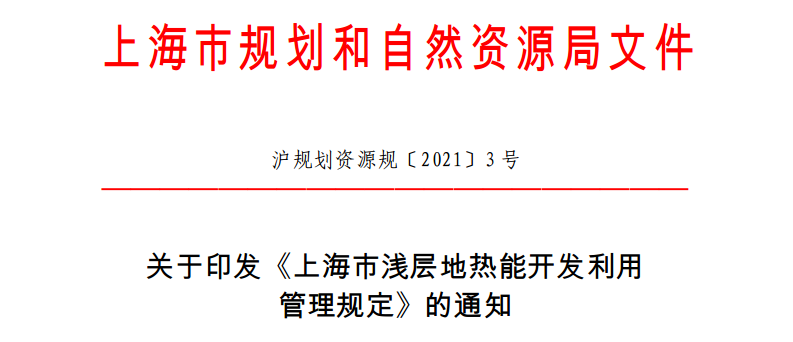 為貫徹新發(fā)展理念,推進“上海2035”實施和五大新城規(guī)劃建設(shè),引導和規(guī)范本市淺層地熱能合理開發(fā)利用,助力本市碳達峰、碳中和目標實現(xiàn),促進本市生態(tài)城市建設(shè),我局制定了《上海市淺層地熱能開發(fā)利用管理規(guī)定》,現(xiàn)予印發(fā),自2021年7月1日起施行,有效期至 2026年6月 30日。