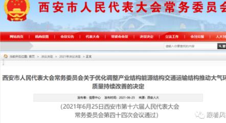 這則消息來(lái)源于2021年6月25日西安市第十六屆人民代表大會(huì)常務(wù)委員會(huì)第四十四次會(huì)議通過(guò)的《西安市人民代表大會(huì)常務(wù)委員會(huì)關(guān)于優(yōu)化調(diào)整產(chǎn)業(yè)結(jié)構(gòu)能源結(jié)構(gòu)交通運(yùn)輸結(jié)構(gòu)推動(dòng)大氣環(huán)境質(zhì)量持續(xù)改善的決定》(以下簡(jiǎn)稱(chēng)《決定》)。