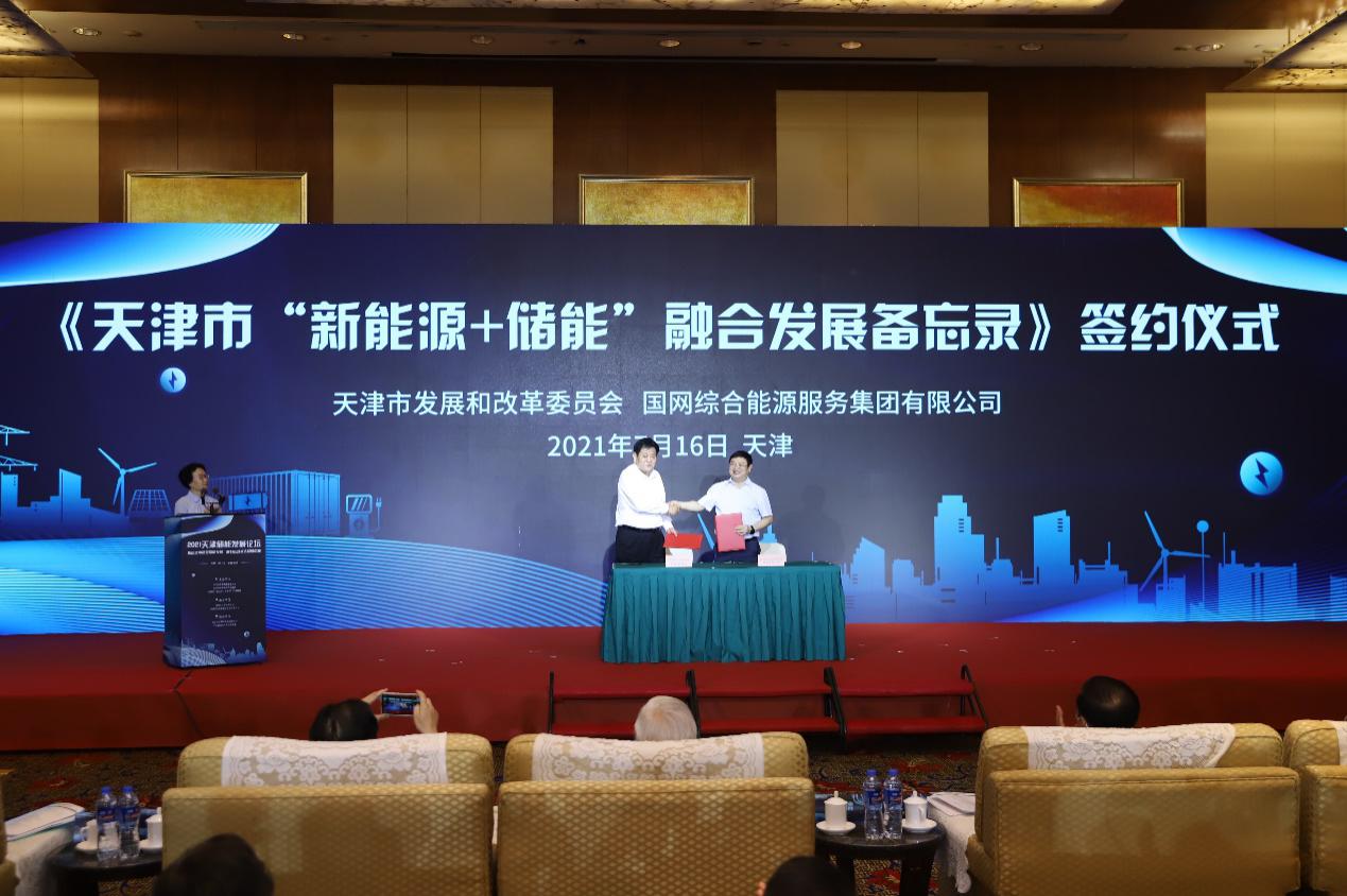 在簽約儀式環(huán)節(jié),天津市發(fā)展和改革委員會(huì)副主任楊志耘與國網(wǎng)綜合能源服務(wù)集團(tuán)有限公司黨委委員、副總經(jīng)理樊功成上臺(tái)簽署《天津市“新能源+儲(chǔ)能”融合發(fā)展備忘錄》。