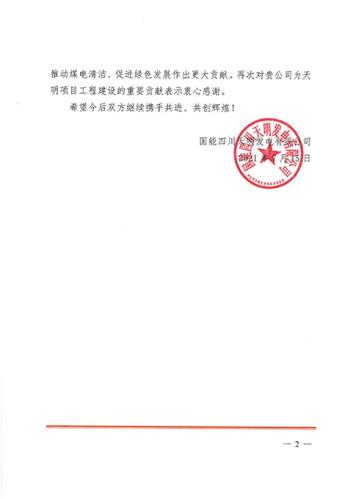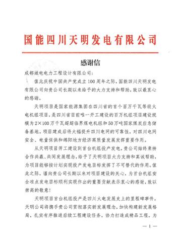 7月15日,四川科銳得實業(yè)集團(tuán)有限公司下屬成都城電電力工程設(shè)計有限公司收到來自國能四川天明發(fā)電有限公司的感謝信,感謝城電公司長期以來給予天明公司的大力支持和幫助。