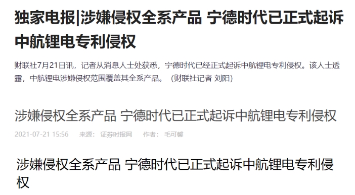 7月21日,多方媒體報道寧德時代已經(jīng)正式起訴中航鋰電專利侵權(quán),中航鋰電涉嫌侵權(quán)范圍覆蓋其全系產(chǎn)品。法律界人士表示,中航鋰電一旦敗訴,全系產(chǎn)品可能面臨禁售。