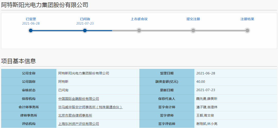7月23日,上海證券交易所項目動態(tài)顯示,阿特斯陽光電力集團股份有限公司(以下簡稱“阿特斯”)上市申請進入“已問詢”狀態(tài)。