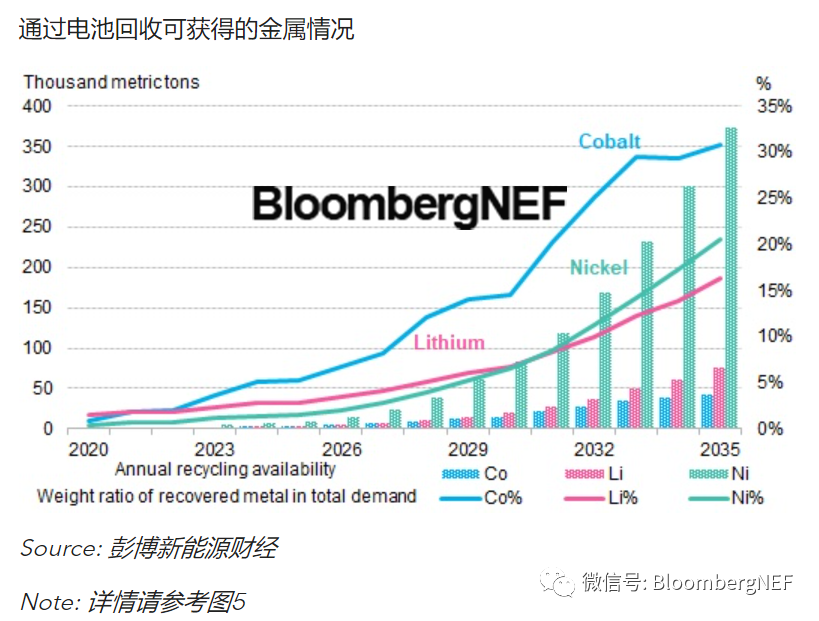 2035年可供回收的退役電池規模將達到500萬噸,回收所得鈷、鋰和鎳分別能夠滿足新電池生產所需對應金屬的30%、16%和21%。回收電池在抵消現貨價格波動和舒緩資源限制方面發揮日益重要的作用。
