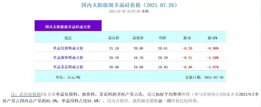 7月28日,中國(guó)有色金屬工業(yè)協(xié)會(huì)硅業(yè)分會(huì)發(fā)布消息,多晶硅價(jià)格延續(xù)緩跌走勢(shì),最大跌幅近2%。