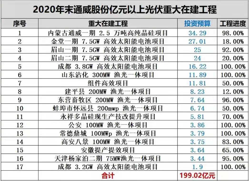 事實上,通威股份很多重大在建工程也都進入收官階段。據黑鷹光伏統計,截止2020年末,通威股份有17個億元以上的光伏重大在建工程,總投資預算達199.02億元,其中14個項目的工程進度在50%以上,10個項目工程進度超過80%。