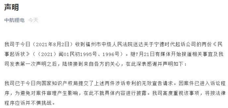 針對被寧德時代起訴專利侵權,中航鋰電2日發布聲明稱,已于2日向國家知識產權局提交了兩件涉訴專利的無效宣告請求。