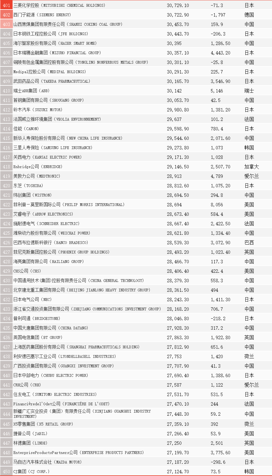 此外,在排名位次的變化上,今年上升最快的是晉能控股集團,大幅躍升325位,位列第138位;山東能源集團上升225名,位列第70位。但是需要注意的是,這兩家公司排名躍升均是由于幾家世界500強能源與礦業公司之間的重組合并。其中,山東能源集團與兗礦集團聯合重組。晉能控股來自多家世界500強的重組與整合,包括原同煤集團、晉煤集團、晉能集團和潞安集團等公司。