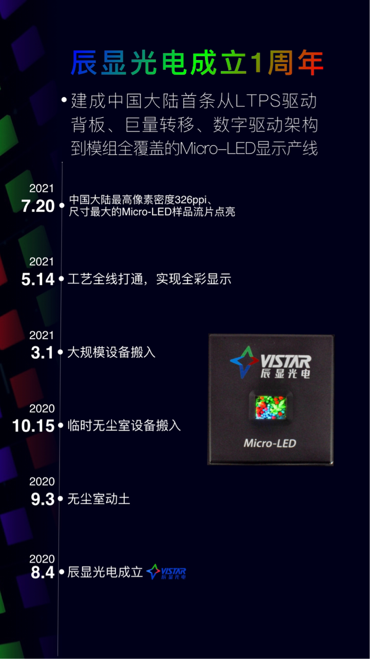 據悉,成都辰顯光電有限公司成立于2020年8月4日,投建的Micro-LED顯示產線于2021年3月1日開始設備搬入,5月14日完成工藝全線打通并實現全彩顯示,7月20日成功點亮326 ppi的1.84英寸Micro-LED可穿戴產品。僅用不到1年時間,辰顯光電率先建成中國大陸首條從LTPS驅動背板、巨量轉移、修復到模組全覆蓋的Micro-LED顯示產線,創造了全球業界產線建設的最快速度。