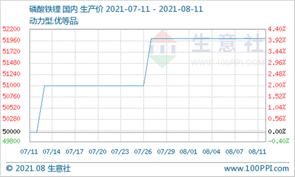根據(jù)生意社監(jiān)測的數(shù)據(jù)顯示,截止8月11日國內動力型優(yōu)等品磷酸鐵鋰均價在52000.00元/噸,最近一周內磷酸鐵鋰市場平穩(wěn)運行為主,相比上周同期價格沒有明顯變化,下游剛需采購,價格波動范圍不大,商談氛圍平淡。
