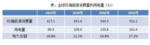 從下表中可以看出,從2019年到2050年全球用電量雖然逐年上升,但在終端能源消費總量中最高為27.2%,其它均為非電力消費。