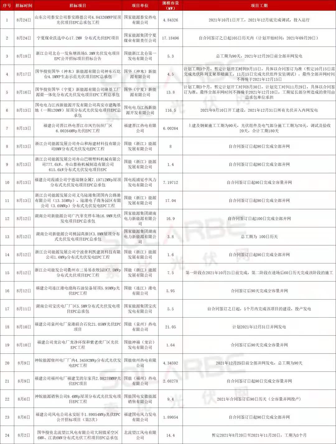 據索比光伏網統計,國家能源集團在8月份發布了24個分布式光伏項目EPC招標,裝機容量合計300MW,大多要求年底前并網。