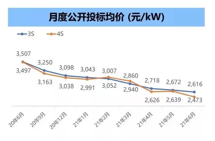 根據(jù)金風科技業(yè)績演示公示,2021年6月,3S平臺風機投標均價在2616元/kW左右,4S平臺風機投標均價在2473元/kW左右。