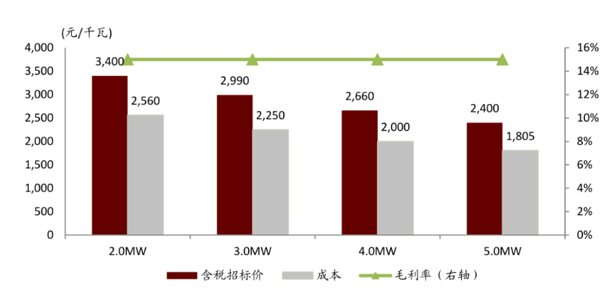 注:理論成本根據(jù)單位功率重量下滑測算,并假設(shè)15%的毛利率反推出理論招標價;未考慮原材料價格變動影響;與實際情況可能存在偏差,不代表廠商口徑