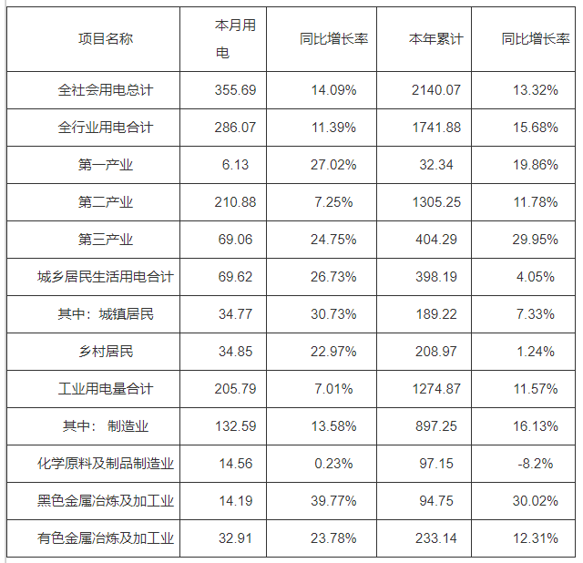 (一)全社會用電量情況。河南全省全社會用電量355.69億千瓦時,同比增加14.09%;累計用電量2140.07億千瓦時,同比增加13.32%。