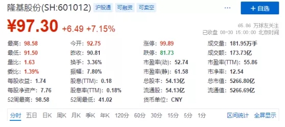 在公布半年報的消息刺激下,隆基今日股價大漲7.15%,收盤報97.30元,再度創下股價新高,總市值達到5266.80億元。