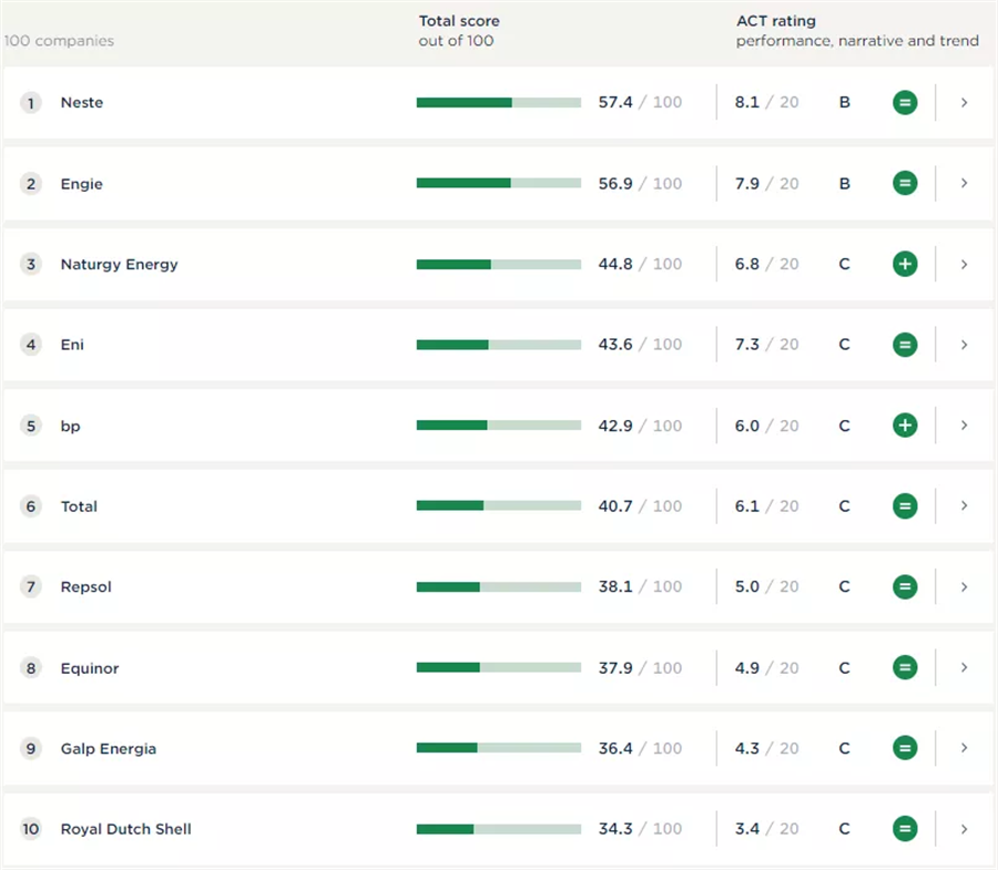 值得注意的是,埃尼集團(Eni)、英國石油(BP)、道達爾(Total)、挪威國家石油公司(Equinor)和殼牌(Shell)等歐洲巨頭占據了前十名中的多數席位。芬蘭可持續燃料和材料公司Neste位居榜首。排名第二的是法國公用事業公司Engie,該公司設定了排放目標,目標是每年增加4千兆瓦的可再生能源。雷普索爾(Repsol)和蓋爾普能源公司(Galp Energia)也進入了前十名,所有表現最好的公司都是歐洲公司。