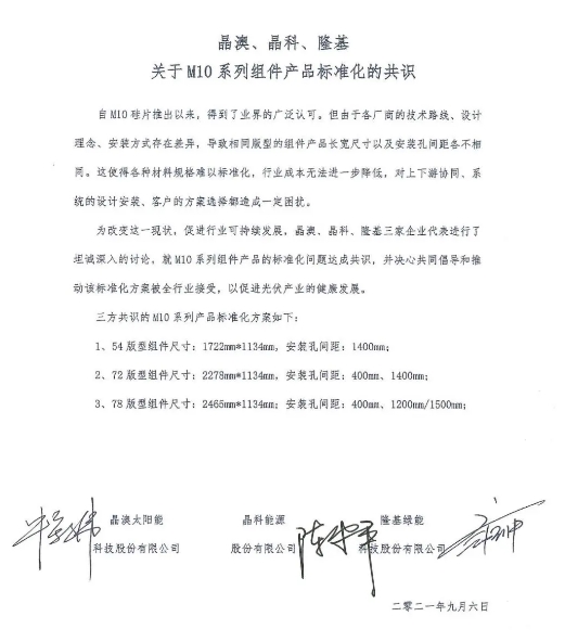 為進一步加強上下游產業協同,為系統設計安裝和客戶方案選擇提供便捷,晶澳、晶科、隆基三家企業經坦誠深入溝通,就M10系列組件產品的標準化問題達成共識,并倡導全行業采用統一標準,促進光伏產業的規范、健康發展。