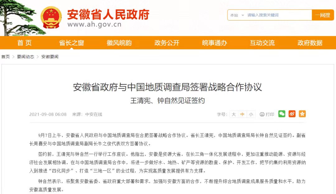2021年9月8日,安徽省人民政府官網(wǎng)發(fā)布《安徽省政府與中國地質(zhì)調(diào)查局簽署戰(zhàn)略合作協(xié)議》一文。該文章指出,9月7日上午,安徽省人民政府與中國地質(zhì)調(diào)查局在合肥簽署戰(zhàn)略合作協(xié)議。雙方將在進(jìn)一步做好水、地?zé)帷⒌V產(chǎn)等資源的勘查、保護(hù)、開發(fā)工作等方面開展合作。