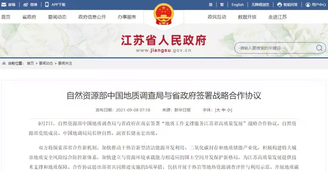同一天,江蘇省人民政府官網(wǎng)發(fā)布《自然資源部中國地質(zhì)調(diào)查局與省政府簽署戰(zhàn)略合作協(xié)議》一文。消息指出,9月7日,自然資源部中國地質(zhì)調(diào)查局與省政府在南京簽署“地質(zhì)工作支撐服務(wù)江蘇省高質(zhì)量發(fā)展”戰(zhàn)略合作協(xié)議。合作協(xié)議提出,雙方共同開展江蘇地區(qū)干熱巖等深部熱能基礎(chǔ)地質(zhì)調(diào)查,評價資源潛力,圈定勘查開發(fā)目標(biāo)靶區(qū)。開展江蘇地區(qū)淺層地?zé)崮苷{(diào)查評價與區(qū)劃,提出科學(xué)合理開發(fā)利用建議。