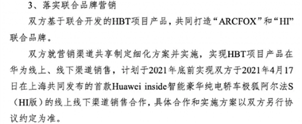 值得一提的是,公告還提到,雙方就營銷渠道共享制定細(xì)化方案并實施,實現(xiàn)HBT項目產(chǎn)品在華為線上、線下渠道銷售,計劃于2021年底前實現(xiàn)雙方于2021年4月17日在上海共同發(fā)布的首款Huawei inside智能豪華純電轎車極狐阿爾法S (HI版)的線上線下渠道銷售合作,具體合作和實施方案以雙方另行協(xié)議約定為準(zhǔn)。