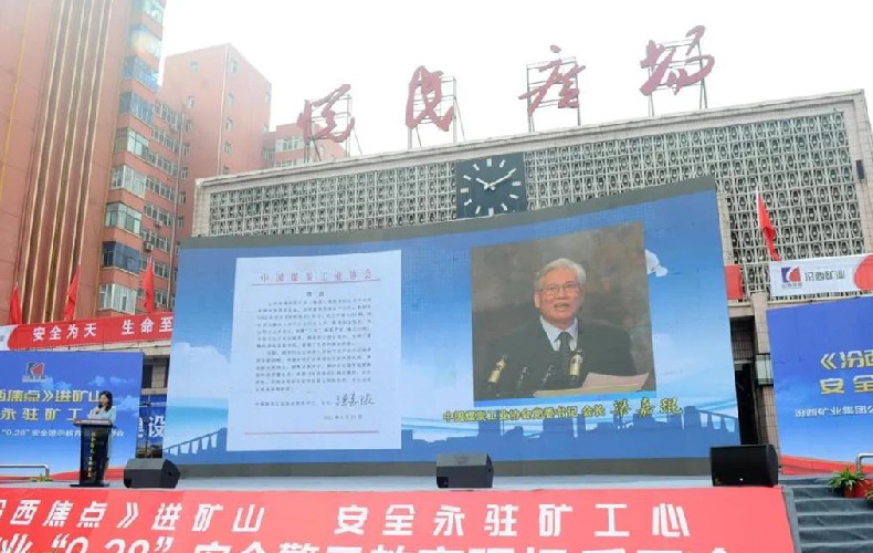 反思活動的開展,正逢新聞中心電視臺《汾西焦點》欄目創辦20年,播發1000期,活動主題是“《汾西焦點》進礦山,安全永駐礦工心”。反思活動的地點,選在了水峪煤業悅民廣場。9月28日,秋意漸濃,涼風陣陣,連綿幾日的秋雨,讓今年的溫度比往年都低。廣場上人頭攢動,只是不同于以往活動時火熱的場景,現場氣氛顯得沉靜、莊嚴。“安全為天生命至上”和“警鐘長鳴 常抓不懈”的橫幅在主席臺兩側格外醒目。主席臺上,兩塊大屏配合中央巨型屏幕,讓所有在活動現場的參與者,都能夠清晰的看到會場播放的警示教育片;二十余塊安全宣傳牌板分布在座位兩側,與兩根巨型燈柱相交,將場地包圍起來,形成一個長方形會場,處處都能感受到濃厚的安全氛圍。