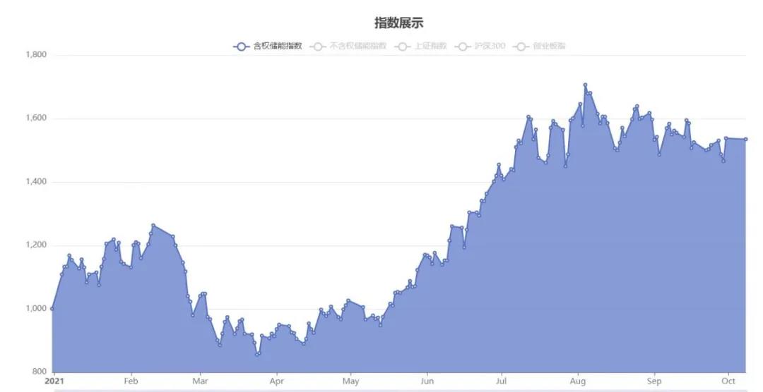 1、儲能指數在3-4月份為低谷期(最低點855),之后強勢走出低谷,在8月初達到階段性高點(1678),較最低點上漲91.7%。8-9月處于震蕩期。指數三季度末與年初相比上漲53.8%。
