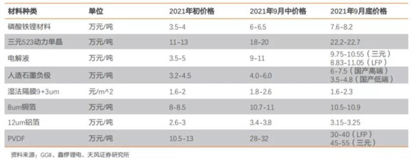 2021年以來,因下游景氣高漲,動力電池原材料供不應(yīng)求,四大主材、鎳/鈷/鋰/銅/鋁、氫氧化鋰、碳酸鋰、六氟磷酸鋰、PVDF、VC等價格集中上揚,部分輔材較年初上漲數(shù)倍,甚至“一貨難求”。