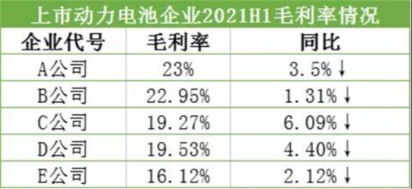 2021上半年頭部5家上市公司動力電池業(yè)務(wù)毛利率均出現(xiàn)了不同程度的下滑,且整體毛利率處于23%及以下。