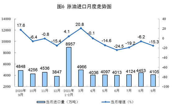 1—9月份,生產原油14984萬噸,同比增長2.5%,比2019年同期增長4.3%,兩年平均增長2.1%;加工原油52687萬噸,同比增長6.2%,比2019年同期增長9.4%,兩年平均增長4.6%。