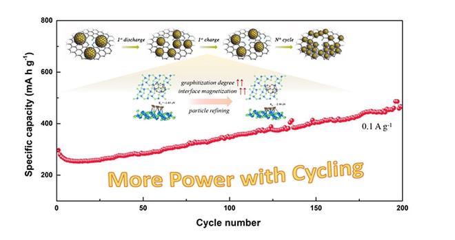 研究發現,FeP納米顆粒在第一個循環中經歷了細化-復合過程,經過數十個循環后,呈現出全區域細化的趨勢。這導致石墨化程度和界面磁化強度逐漸增加,為Na+存儲提供了更多的額外活性位點,并有助于提升循環容量。這種容量提升現象也可以擴展至鋰離子電池,在10A/g下循環5000次后,鋰離子電池的容量保持率為90.3%。